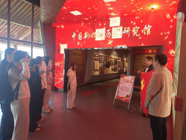 随后,支部一行来到被誉为“苏南小延安”的红色李巷。全体党员佩戴党徽,面向鲜红党旗,庄严举起右手,重温入党誓词,在铿锵誓言中回溯初心、牢记使命。在讲解员的带领下,大家参观了新四军历史研究馆,认真聆听陈毅、江渭清、李坚真等革命先辈的英雄事迹。通过一幅幅历史图片、一件件珍贵实物、一段段感人故事,深刻感悟当年新四军将士不畏艰难、英勇奋斗的“铁军精神”,进一步增强了作为新时代党员的责任感与担当意识。参观结束后,全体党员在红色李巷合影,定格红色记忆,传承革命精神。